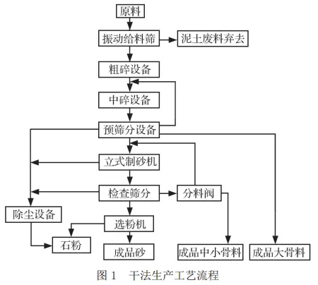 圖1所示為典型的干法生產工藝流程,原料經過振動給料篩和篩分機組合篩除泥土以后,一般要經過粗碎和中碎兩道破碎后再進行檢查篩分,通過篩分將礦石分成3個部分:達不到產品粒度要求的最粗一級礦石返回中碎設備重新破碎,這部分返料在中細碎和篩分之間形成一個閉路循環(huán);中等粒度礦石直接作為骨料成品進入產品倉或者堆場;小于一定粒度的原料進入立式整形制砂機進行整形制砂,制砂部分產生的石粉通過選粉機和空氣除塵設備收集起來,進入密閉的石粉倉。